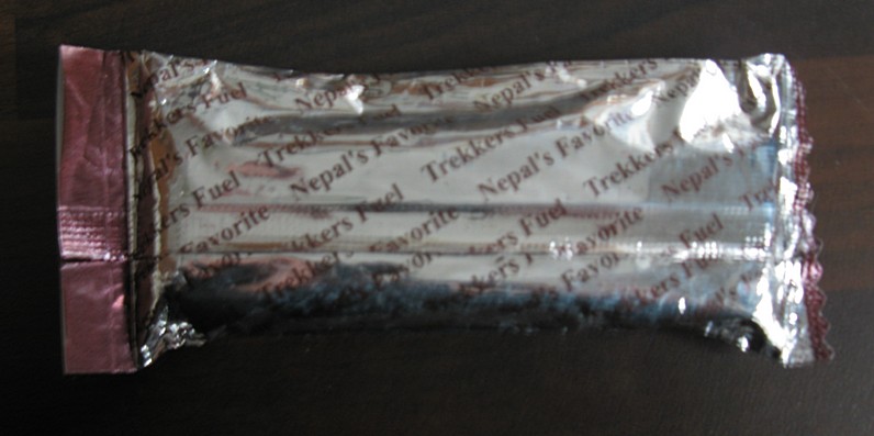 Dabei handelt es sich um einen Riegel der für Bergsteiger und Co. gedacht ist. Das heißt möglichst wenig Gepäck und was auch immer dabei ist sollte möglichst viel bringen. Das gilt natürlich auch für die Nahrung und genau da setzt Nepal’s Favorite an. Mein Onkel meinte, dass der Riegel gut und gern einen Tag über den Hunger stillt und man sonst nichts groß braucht. Das wollte ich natürlich auch mal probieren. Heute hab ich das dann auch gemacht und um 9:30 den Riegel eingeworfen. Geschmeckt hat er auch, Banane/Schoko, und er sah spannend aus ;).