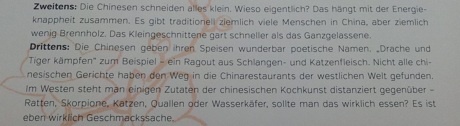 Der Unterschied zum Durchschnitt findet sich darin, dass man sich hier der echten chinesischen Küche schon etwas mehr annähert. Zum Beispiel findet man da auch gebratene Geflügelhaut am Spieß.