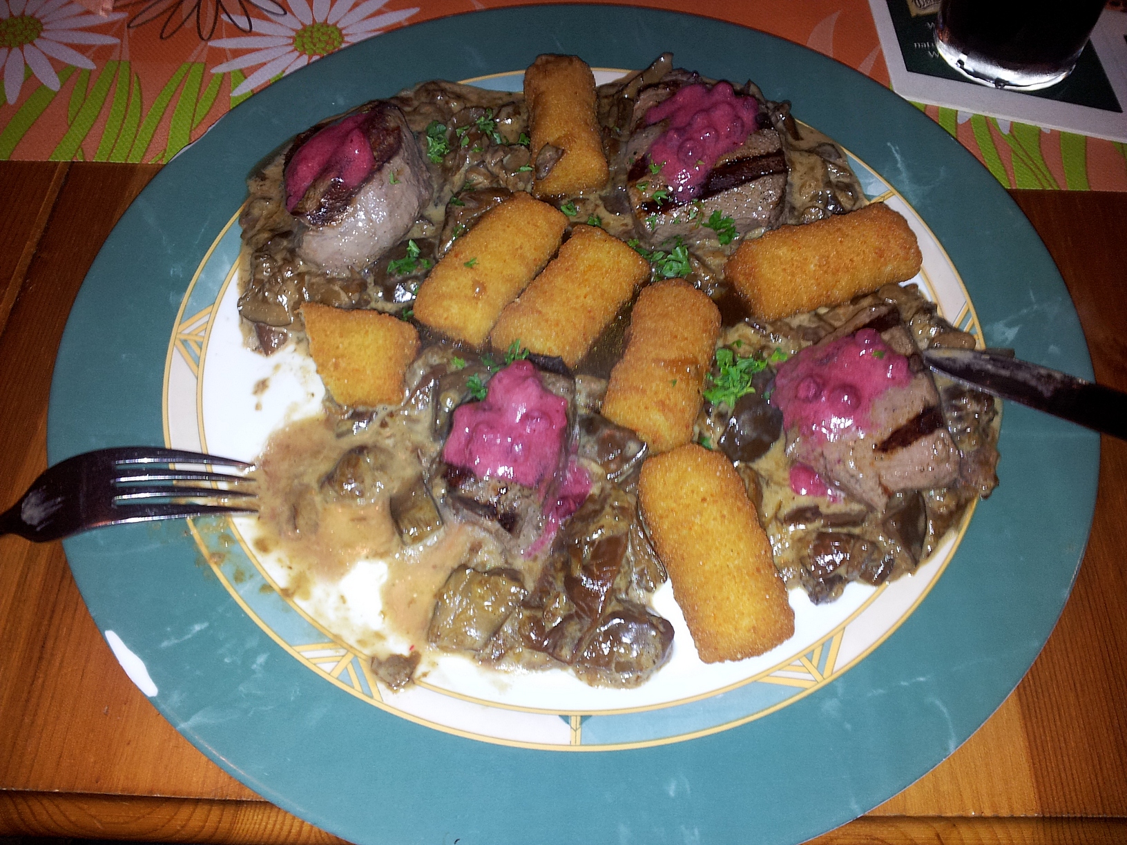 Nun, als ich und meine Familie da waren hatte ich mich für die Rehmedaillons mit Kroketten und Pilzen entschieden. Besonders schön war, dass die Pilze und die Soße einfach so geschmeckt haben wie ich es aus meiner Umgebung kenne. Die Medaillons waren wirklich zart und ziemlich auf den Punkt. Ich war rundum zufrieden…