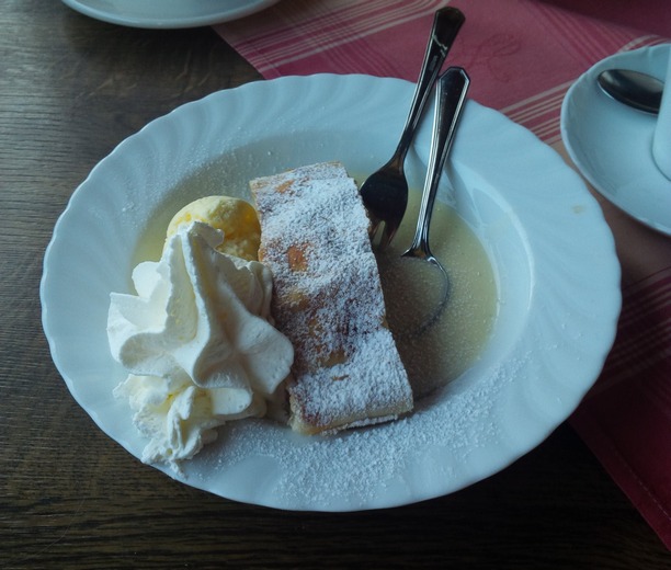 Sachsenklause - ApfelstrudelWie Ihr sehen könnt, dazu gab es eine Kugel Vanilleeis, Schlagsahne und Vanillesoße. Vorweg sollte ich jetzt wohl sagen, dass ich lange keinen Apfelstrudel mehr hatte. Irgendwie hab ich den zu selten frisch bekommen und so keine Lust mehr drauf. In diesem Fall war es aber ein wirklich frischer und hausgemachter Apfelstrudel. Die Apfelstücken hatten noch ein wenig biss und dann noch mit der warmen Vanillesoße, ein Traum! Ich fand es wirklich sehr lecker. Die Portion war auch alles andere als klein, von daher hat auch das eine Stück gereicht.